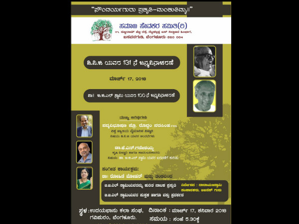 ಸಮಾಜ ಸೇವಕರ ಸಮಿತಿ: ಕನ್ನಡದ ದಾರ್ಶನಿಕ ಕವಿ, ಕಾವ್ಯರ್ಷಿ ಡಿ.ವಿ.ಜಿಯವರ 131 ನೇ ಜನ್ಮದಿನ. ನಮ್ಮ ಸಮಾಜ ಸೇವಕರ ಸಮಿತಿಯು ಕಳೆದ 13 ವರ್ಷಗಳಿಂದ ಪ್ರತಿವರ್ಷ ಮಾರ್ಚ್ 17 ರಂದೇ ಡಿವಿಜಿಯವರ ಜನ್ಮದಿನವನ್ನು ಅರ್ಥಪೂರ್ಣವಾಗಿ ಆಚರಿಸಿಕೊಂಡು ಬಂದಿದೆ.