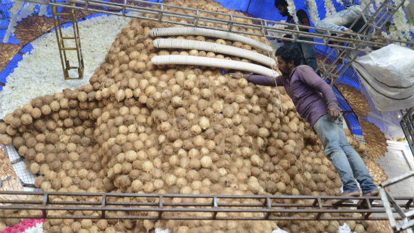 "ಗಣೇಶ ಮೂರ್ತಿ ನಿರ್ಮಾಣಕ್ಕೆ 50 ಮಂದಿ ಕಳೆದ 21 ದಿನಗಳಿಂದ ಕೆಲಸ ಮಾಡುತ್ತಿದ್ದು ಸೋಮುವಾರದಿಂದ ತೆಂಗಿನ ಕಾಯಿ ಗಣಪನ ದರ್ಶನ ಪಡೆಯಬಹುದಾಗಿದೆ. ತೆಂಗಿನ ಕಾಯಿ ಬಹಳ ದಿನಗಳ ಕಾಲ ಕೆಡದೆ ಇರುತ್ತದೆ. ಹೀಗಾಗಿ ತೆಂಗಿನ ಕಾಯಿಯನ್ನು ಬಳಸಿ ಗಣಪನ ಮೂರ್ತಿಯನ್ನು ನಿರ್ಮಿಸಲಾಗುತ್ತಿದೆ. ಕಳೆದ ವರ್ಷ ಕಬ್ಬನ್ನು ಬಳಸಿ ಗಣಪನ ಮೂರ್ತಿಯನ್ನು ನಿರ್ಮಿಸಲಾಗಿತ್ತು ಹಾಗೂ ಅದಕ್ಕೂ ಹಿಂದಿನ ವರ್ಷ 400 ಕೆಜಿ ಹತ್ತಿ ಬಳಸಿ ಬೃಹತ್ ಗಣಪನ ಮೂರ್ತಿಯನ್ನು ನಿರ್ಮಿಸಿದ್ದೆವು" ಎಂದು ಟ್ರಸ್ಟಿನ ವ್ಯವಸ್ಥಾಪಕರಾದ ರಾಮ್ ಮೋಹನ ರಾಜು ಅವರು ತಿಳಿಸಿದರು.