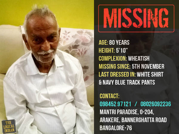 80 ವರ್ಷದ ಸುಮಾರು 5.10 ಅಡಿ ಎತ್ತರದ ಕಪಿಲ್ ಶರ್ಮಾ ಅವರ ತಂದೆ ನ.5ರ ಸಂಜೆ ಅರಕೆರೆಯ ಮಂತ್ರಿ ಪ್ಯಾರಡೈಸ್ ಅಪಾರ್ಟ್ಮೆಂಟ್ನಿಂದ ಸಂಜೆ 5 ಗಂಟೆ ಸುಮಾರಿಗೆ ಹೊರಹೋಗುವುದು ಸಿಸಿಟಿವಿಯಲ್ಲಿ ದಾಖಲಾಗಿದ್ದು, ನಂತರ ಅವರು ಪತ್ತೆಯಾಗಿಲ್ಲ.