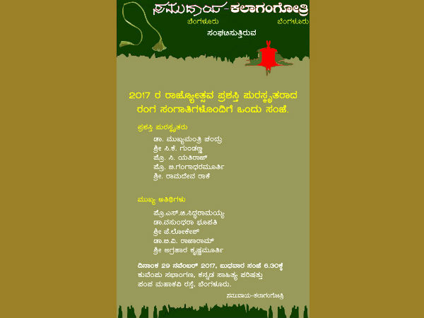 ಬೆಂಗಳೂರು, ನವೆಂಬರ್ 27 : ಸಮುದಾಯ-ಕಲಾಗಂಗೋತ್ರಿ ಸಂಸ್ಥೆಯು 2017 ರ ರಾಜ್ಯೋತ್ಸವ ಪ್ರಶಸ್ತಿ ಪುರಸ್ಕೃತರಾದ ರಂಗ ಸಂಗಾತಿಗಳೊಂದಿಗೆ ಒಂದು ಸಂಜೆ ಎನ್ನುವ ಕಾರ್ಯಕ್ರಮವನ್ನು ನ.29ರಂದು ಚಾಮರಾಜಪೇಟೆಯ ಕನ್ನಡ ಸಾಹಿತ್ಯ ಪರಿಷತ್ತಿನಲ್ಲಿ ಆಯೋಜಿಸಿದೆ.