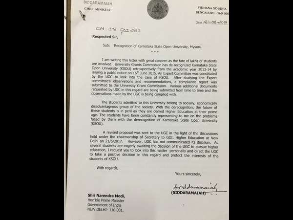 ಯುಜಿಸಿಯಿಂದ ಕೆಎಸ್ ಒಯು ಅಮಾನ್ಯತೆ. ಪ್ರಧಾನಿಗೆ ಪತ್ರ ಬರೆದ ಮುಖ್ಯಮಂತ್ರಿ ಸಿದ್ದರಾಮಯ್ಯ. ಯುಜಿಸಿಗೆ ಸಕಾರಾತ್ಮಕ ನಿರ್ಧಾರ ಕೈಗೊಳ್ಳಲು ಸೂಚಿಸುವಂತೆ ಮನವಿ.