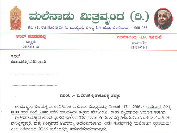 ಬೆಂಗಳೂರು, ಜನವರಿ 16 : ಮಲೆನಾಡು ಮಿತ್ರವೃಂದ ವಾರ್ಷಿಕ ಕ್ರೀಡಾಕೂಟವನ್ನು ಭಾನುವಾರ ಬೆಂಗಳೂರಿನಲ್ಲಿ ಹಮ್ಮಿಕೊಂಡಿದೆ. ಜಾಲಹಳ್ಳಿ ಬಳಿಯ ಎಚ್ಎಂಟಿ ಆಟದ ಮೈದಾನದಲ್ಲಿ ಜ.17ರ ಭಾನುವಾರ ಈ ಕ್ರೀಡಾಕೂಟ ನಡೆಯಲಿದೆ.