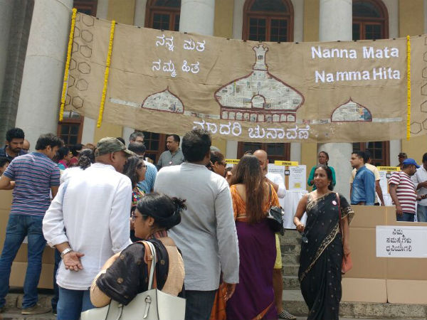 ಸಿಟಿಜನ್ಸ್ ಅಫ್ ಬೆಂಗಳೂರು ಗ್ರೂಪ್ ವತಿಯಿಂದ ನಗರದ ಟೌನ್ ಹಾಲ್ ಮುಂಭಾಗದಲ್ಲಿ ಮಾದರಿ ಚುನಾವಣೆ. ವಿವಿಧ ಸಂಸ್ಥೆಯ ನೂರಾರು ಜನರು ಮತ ಹಾಕಿದರು. ಬೆಂಗಳೂರಿನಲ್ಲಿ ಮುಖ್ಯವಾಗಿ ಕಸ ವಿಲೇವಾರಿ ಅವ್ಯವಸ್ಥೆ. ಗಾರ್ಬೆಜ್ ಮಾಫಿಯ. ರಸ್ತೆ. ನೀರು. ಚರಂಡಿ. ಮಹಿಳಾ ಸುರಕ್ಷತೆ ಸೇರಿ ನಾನಾ ಸಮಸ್ಯೆ ಗಳನ್ನು ಬಗೆಹರಿಸುವ ನಾಯಕರಿಗೆ ಚುನಾವಣೆಯಲ್ಲಿ ಮತದಾನ ಮಾಡುವ ಬಗ್ಗೆ ಮತದಾರರಲ್ಲಿ ಜಾಗೃತಿ ಮೂಡಿಸುವ ಸಲುವಾಗಿ ಈ ಕಾರ್ಯಕ್ರಮ ಆಯೋಜಿಸಲಾಗಿದೆ ಎಂದು ಸಂಸ್ಥೆಯ ಸದಸ್ಯ ವಿನೋದ್ ತಿಳಿಸಿದರು.