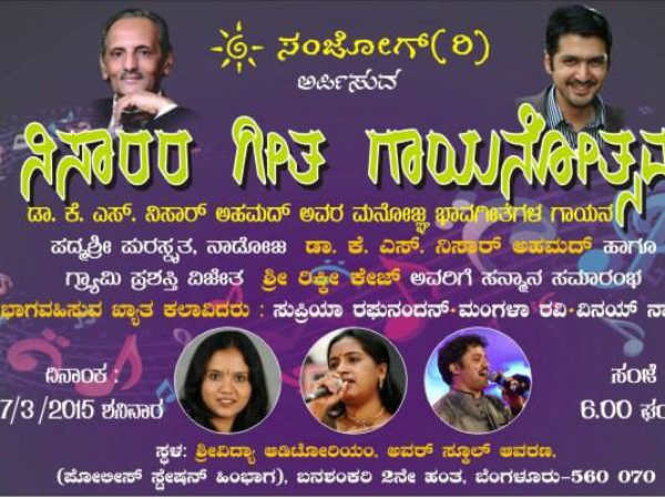 ಕವಿ ಕೆ. ಎಸ್ .ನಿಸಾರ್ ಅಹಮದ್ ಅವರ ಗೀತೆಗಳನ್ನು ಗಾಯಕಿಯರಾದ ಸುಪ್ರಿಯಾ ರಘುನಂದನ್, ಮಂಗಳಾ ರವಿ ಮತ್ತು ವಿನಯ್ ನಾಡಿಗ್ ಪ್ರಸ್ತುತಪಡಿಸಲಿದ್ದಾರೆ. ಕವಿ ನಿಸಾರ್ ಅಹಮದ್ ಮತ್ತು ಗ್ರ್ಯಾಮಿ ಪ್ರಶಸ್ತಿ ಪುರಸ್ಕೃತ ರಿಕ್ಕೀ ಕೇಜ್ ಅವರಿಗೆ ಸನ್ಮಾನ ಹಮ್ಮಿಕೊಳ್ಳಲಾಗಿದೆ ಎಂದು ಪ್ರಕಟಣೆ ತಿಳಿಸಿದೆ.