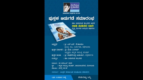 ಬೆಂಗಳೂರು, ನವೆಂಬರ್ 9: ನೀಲಿಮಾ ಪ್ರಕಾಶನವು ಡಾ. ಶಿವಾನಂದ ಕುಬಸದ ಅವರ 'ನಾಡಿ ಮಿಡಿತದ ದಾರಿ' ಎನ್ನುವ ಪುಸ್ತಕದ ಬಿಡುಗಡೆ ಸಮಾರಂಭವನ್ನು ಹಮ್ಮಿಕೊಂಡಿದೆ.
