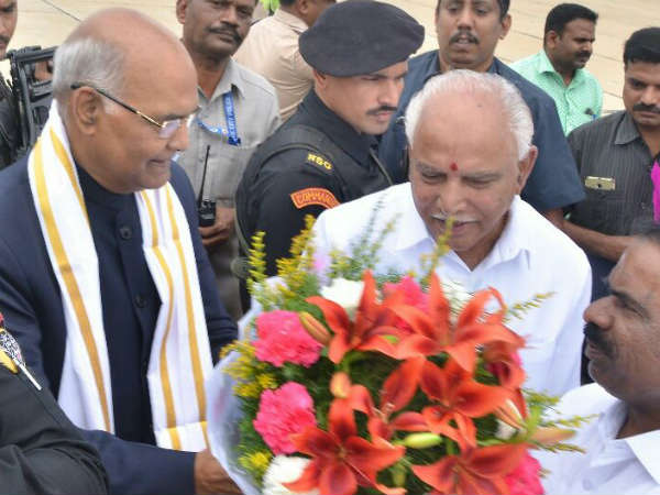 ವಿಶೇಷ ವಿಮಾನದ ಮೂಲಕ ಬೆಳಗ್ಗೆ 10.30ಕ್ಕೆ ಬೆಂಗಳೂರಿನ ಹೆಚ್ಎಎಲ್ ವಿಮಾನ ನಿಲ್ದಾಣಕ್ಕೆ ಬಂದಿಳಿದ ಕೋವಿಂದ್ ರನ್ನು ಬಿಜೆಪಿ ರಾಜ್ಯಾಧ್ಯಕ್ಷ ಬಿಎಸ್ ಯಡಿಯೂರಪ್ಪ ಅವರು ಆತ್ಮೀಯವಾಗಿ ಸ್ವಾಗತಿಸಿದರು.