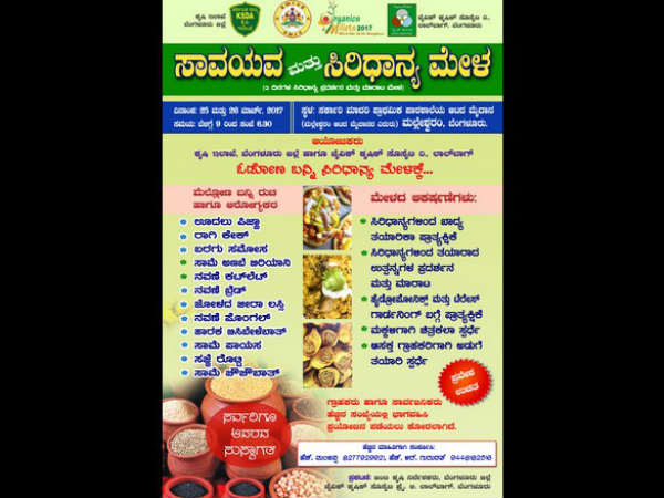 ಸಾವಯವ ಉತ್ಪನ್ನಗಳ ಹಾಗೂ ಸಣ್ಣ ಸಿರಿಧಾನ್ಯಗಳ ಬಗ್ಗೆ ಗ್ರಾಹಕರಲ್ಲಿ ಜಾಗೃತಿ ಮೂಡಿಸುವ ಉದ್ದೇಶದಿಂದ ಮಾರ್ಚ್ 25 ಮತ್ತು 26 ರಂದು ಬೆಂಗಳೂರಿನ ಮಲ್ಲೇಶ್ವರಂನಲ್ಲಿ ಸಾವಯವ ಮತ್ತು ಸಿರಿಧಾನ್ಯ ಮೇಳ ಆಯೋಜಿಸಲಾಗಿದೆ.