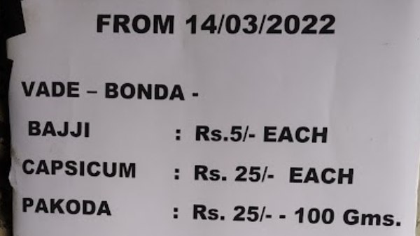 ನೂತನ ದರ ಪಟ್ಟಿ; ಪ್ರತಿ ಬಜ್ಜಿಗೆ 5 ರೂ., ಕ್ಯಾಪ್ಸಿಕಂ ಬಜ್ಜಿ ರೂ. 25, ಪಕೋಡಾ 100 ಗ್ರಾಂಗೆ ರೂ. 25 ಆಗಲಿದೆ ಎಂದು ಬೋರ್ಡ್ನಲ್ಲಿ ಮಾಹಿತಿ ನೀಡಲಾಗಿದೆ.