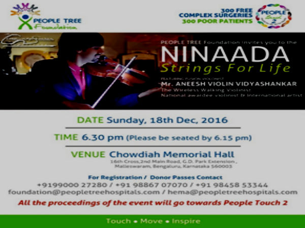 ಅನೀಶ್ ವಿದ್ಯಾಶಂಕರ್ ಅವರ 'ನಿನಾದ' ವಾಯ್ಲಿನ್ ಕಾರ್ಯಕ್ರಮಕ್ಕೆ ಪ್ರಾಯೋಜಕರನ್ನೂ ಪೀಪಲ್ ಟ್ರೀ ಆಸ್ಪತ್ರೆ ಆಹ್ವಾನಿಸಿದ್ದು, ಪ್ರಾಯೋಜಕರಿಗೆ ಮೂವತ್ತು ಉಚಿತ ಪಾಸ್ ಅನ್ನು ನೀಡಲಾಗುವುದು ಎಂದು ಆಸ್ಪತ್ರೆ ತನ್ನ ಪತ್ರಿಕಾ ಪ್ರಕಟಣೆಯಲ್ಲಿ ತಿಳಿಸಿದೆ.