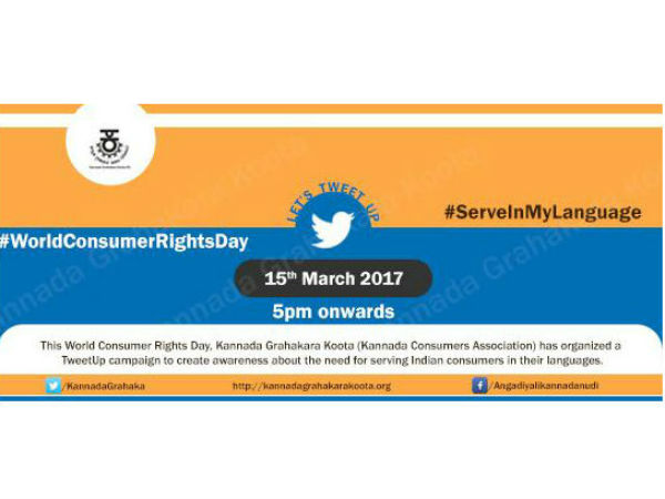 ಡಿಸೆಂಬರ್ 24, 2016 ರಂದು ರಾಷ್ಟ್ರೀಯ ಗ್ರಾಹಕ ದಿನದ ಅಂಗವಾಗಿ ಕನ್ನಡ ಗ್ರಾಹಕರ ಕೂಟದ ವತಿಯಿಂದ ಹಮ್ಮಿಕೊಳ್ಳಲಾಗಿದ್ದ #ServeInMyLanguage ಟ್ವಿಟ್ಟರ್ ಅಭಿಯಾನದಂತೆಯೇ ಇದೇ ಮಾರ್ಚ್ 15 ವಿಶ್ವ ಗ್ರಾಹಕರ ದಿನದಂದು ಸಂಜೆ 5ರಿಂದ ಟ್ವಿಟ್ಟರಿನಲ್ಲಿ ನಮ್ಮ ನುಡಿಗಳಲ್ಲಿ ಎಲ್ಲ ಹಂತದ ಗ್ರಾಹಕ ಸೇವೆಗೆ ಆಗ್ರಹಿಸಿ ಕನ್ನಡ ಗ್ರಾಹಕರ ಕೂಟ ಮತ್ತೊಮ್ಮೆ #ServeInMyLanguage ಟ್ವಿಟ್ಟರ್ ಅಭಿಯಾನವನ್ನು ಹಮ್ಮಿಕೊಂಡಿದೆ.