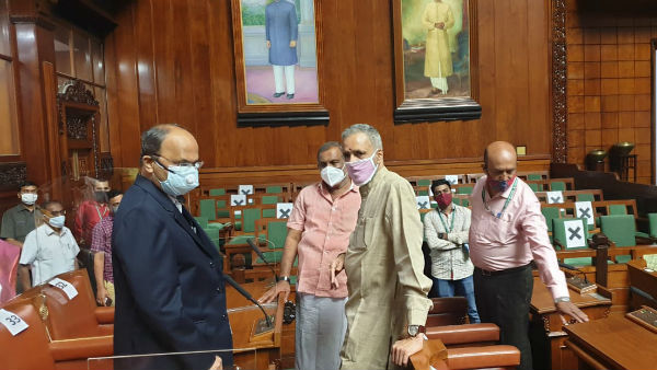 ಬೆಂಗಳೂರು, ಆ. 24: ಕೊರೊನಾ ವೈರಸ್ ಹಿನ್ನೆಲೆಯಲ್ಲಿ ವಿಧಾನ ಮಂಡಳ ಅಧಿವೇಶನ ಎಲ್ಲಿ ನಡೆಸಬೇಕು ಎಂಬ ಗೊಂದಲಕ್ಕೆ ತೆರೆಬಿದ್ದಿದೆ. ವಿಧಾನಸೌಧದಲ್ಲೇ ಮಳೆಗಾಲದ ಅಧಿವೇಶನ ಮಾಡಲು ತೀರ್ಮಾನ ಮಾಡಲಾಗಿದೆ ಎಂದು ಕಾನೂನು ಸಚಿವ ಮಾಧುಸ್ವಾಮಿ ಹೇಳಿಕೆ ಕೊಟ್ಟಿದ್ದಾರೆ. ವಿಧಾನಸೌಧದಲ್ಲಿ ಮಾತನಾಡಿದ ಅವರು, ಸಭಾಧ್ಯಕ್ಷ ವಿಶ್ವೇಶ್ವರ ಹೆಗಡೆ ಕಾಗೇರಿ ಹಾಗೂ ವಿಧಾನಸಭೆ ಕಾರ್ಯದರ್ಶಿ ಕೆ.ಎಂ. ವಿಶಾಲಕ್ಷಿ ಸದನವನ್ನು ವೀಕ್ಷಣೆ ಮಾಡಿದ್ದಾರೆ. ಜೊತೆಗೆ ವಿಧಾನಸೌಧದಲ್ಲೇ ಸದನ ನಡೆಸಲು ಸ್ಪೀಕರ್ ತೀರ್ಮಾನ ಮಾಡಿದ್ದಾರೆ ಎಂದರು.