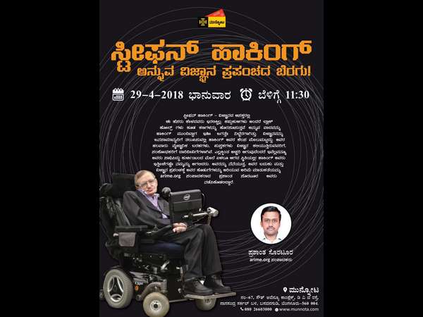 ಕಾರ್ಯಕ್ರಮವು ಏಪ್ರಿಲ್ 29ರಂದು ಮುನ್ನೋಟ ಮಳಿಗೆಯಲ್ಲಿ ಬೆಳಗ್ಗೆ 11.30ಕ್ಕೆ ನಡೆಯಲಿದೆ. ಇಂಗ್ಲಿಷ್ ,ಭೌತಶಾಸ್ತ್ರಜ್ಞ, ಕಾಸ್ಮೊಲಾಜಿಸ್ಟ್ ಸ್ಟೀಫನ್ ಹಾಕಿಂಗ್(8 ಜನವರಿ 1942-14 ಮಾರ್ಚ್ 2018) 40 ವರ್ಷಕ್ಕೂ ಅಧಿಕ ಕಾಲದಿಂದ ವಿಜ್ಞಾನ ಕ್ಷೇತ್ರದಲ್ಲಿ ಸೇವೆ ಸಲ್ಲಿಸಿದವರು. ಹಲವು ವರ್ಷಗಳಿಂದ ಅಮಿಯೊಟ್ರೋಫಿಕ್ ಲ್ಯಾಟರಲ್ ಸ್ಕ್ಲೆರಾಸಿಸ್ (ಅಥವಾ ALS)ಎಂಬ ತೀವ್ರತರದ ಸ್ನಾಯುಚಾಲಕ ನರಕೋಶದ ಖಾಯಿಲೆಗೆ ತುತ್ತಾಗಿ ವಿಪರೀತ ಅಶಕ್ತತೆ ಹೊಂದಿದ್ದರು.