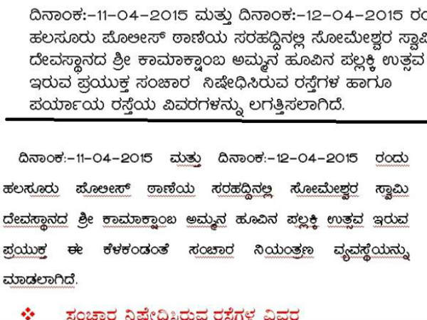 ಬೆಂಗಳೂರು ಸಂಚಾರಿ ಪೊಲೀಸರು ಈ ಕುರಿತು ಪ್ರಕಟಣೆ ಹೊರಡಿಸಿದ್ದಾರೆ. ಈ ಸಂಚಾರ ಮಾರ್ಗ ಬದಲಾವಣೆ ಏ.11ರ ಶನಿವಾರ ಮತ್ತು ಏ.12ರ ಭಾನುವಾರ ಜಾರಿಯಲ್ಲಿರುತ್ತದೆ. ವಾಹನ ಸವಾರರು ಮತ್ತು ಸಾರ್ವಜನಿಕರು ಇಲಾಖೆಯೊಂದಿಗೆ ಸಹಕರಿಸಬೇಕು ಎಂದು ಪೊಲೀಸರು ಮನವಿ ಮಾಡಿದ್ದಾರೆ. [ದೊಮ್ಮಲೂರಿನ ಚೊಕ್ಕನಾಥಸ್ವಾಮಿ ಬಗ್ಗೆ ತಿಳಿಯಿರಿ]