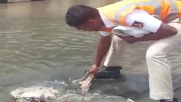 ಬರಿ ಕೈಯಿಂದ ಸಂಚಾರಿ ಪೊಲೀಸರು ಒಳಚರಂಡಿ ಸ್ವಚ್ಛ