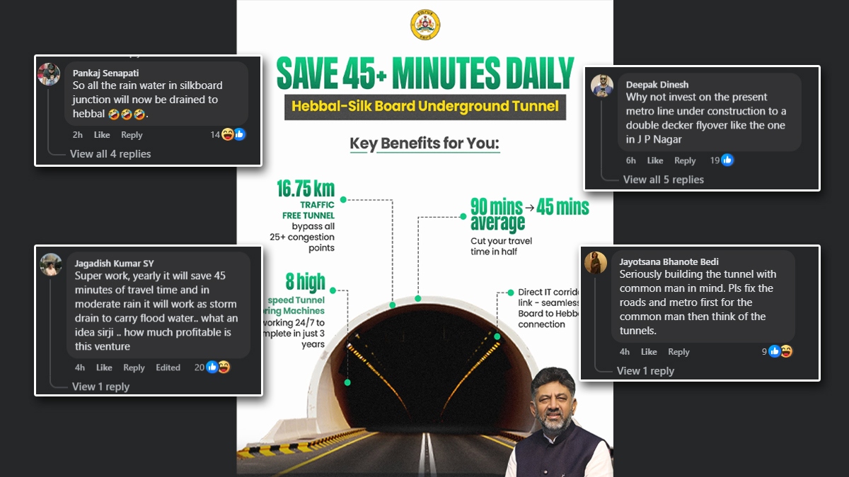 ಬೆಂಗಳೂರು ತನ್ನ ವೇಗ ಹಾಗೂ ಸ್ಮಾರ್ಟ್ ಹಾದಿಯಲ್ಲಿದೆ. ಏಕೆಂದರೆ ನೀವು ಉತ್ತಮ ಪ್ರಯಾಣಕ್ಕೆ ಅರ್ಹರು ಎಂದು ಅವರು ಹೇಳಿದ್ದಾರೆ. ಆದರೆ ಸುರಂಗ ಮಾರ್ಗದ ಬಗ್ಗೆ ಕೆಲವರು ಭಾರೀ ವಿರೋಧ ವ್ಯಕ್ತಪಡಿಸಿದ್ದಾರೆ. ಅಲ್ಲದೇ ಬೆಂಗಳೂರು ಮಾತ್ರ ಅಭಿವೃದ್ಧಿಯಾದರೆ ಸಾಕೇ ಎಂದು ಕೆಲವರು ಪ್ರಶ್ನಿಸಿದ್ದಾರೆ.