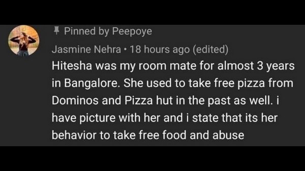 ಹಿತೇಶಾ ಬೆಂಗಳೂರಿನಲ್ಲಿ ನನಗೆ ಮೂರು ವರ್ಷಗಳ ಕಾಲ ರೂಂ ಮೇಟ್ ಆಗಿದ್ದಳು. ಈ ಹಿಂದೆಯೂ ಪಿಜ್ಜಾವನ್ನು ಹೀಗೇ ಆರ್ಡರ್ ಮಾಡಿ ತರಿಸಿಕೊಳ್ಳುತ್ತಿದ್ದಳು. ಆಗಲೂ ಹೀಗೇ ಮಾಡುತ್ತಿದ್ದಳು. ಆಹಾರವನ್ನು ಉಚಿತವಾಗಿ ತೆಗೆದುಕೊಳ್ಳುವುದು ಹಾಗೂ ನಿಂದನೆ ಮಾಡುವುದನ್ನು ಮಾಡುತ್ತಿದ್ದಳು ಎಂದು ಹಿತೇಶಾ ಚಂದ್ರಾನಿ ಸ್ನೇಹಿತೆಯೊಬ್ಬರು ಸಾಮಾಜಿಕ ಜಾಲತಾಣದಲ್ಲಿ ಪೋಸ್ಟ್ ಮಾಡಿದ್ದಾರೆ.