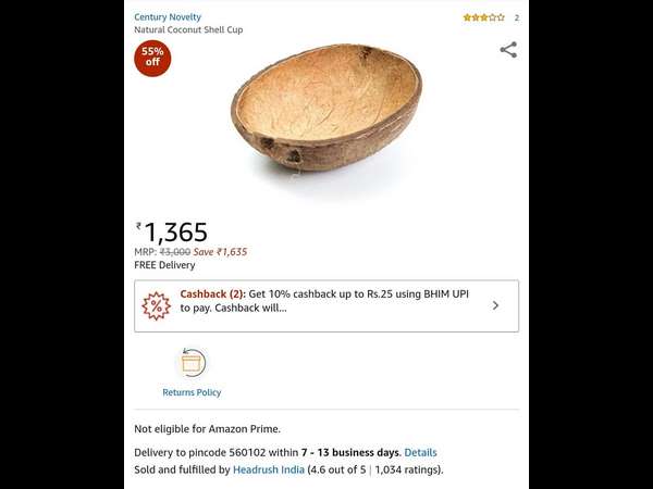 ಕರ್ನಾಟಕದಲ್ಲಿ 30-35 ರೂಪಾಯಿ ತೆತ್ತು ತೆಂಗಿನ ಕಾಯಿ ಕುಡಿಯುತ್ತೇವೆ. ಕೇರಳದಲ್ಲಂತೂ ಹಣವೇ ನೀಡದೇ ತೆಂಗಿನಕಾಯಿ ಪಡೆಯುತ್ತಾರೆ ಆದರೆ ಅಮೆಜಾನ್ ತೆಂಗಿನಚಿಪ್ಪಿಗೆ 1000 ಕ್ಕಿಂತಲೂ ಹೆಚ್ಚಿನ ಬೆಲೆಗೆ ಮಾರುತ್ತಿದೆ ಎಂದು ಹಲವರು ಹುಬ್ಬೇರಿಸಿದ್ದಾರೆ.