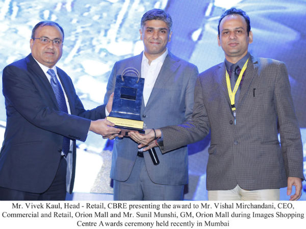 ಮುಂಬೈನ ದಿ ರಿನೈಸಾನ್ಸ್ ನಲ್ಲಿ ಮೇ 7 ಮತ್ತು 8 ರಂದು ನಡೆದ ಕಾರ್ಯಕ್ರಮದಲ್ಲಿ ಸಿಬಿಆರ್ಇಯ ರೀಟೇಲ್ ಮುಖ್ಯಸ್ಥ ವಿವೇಕ್ ಕೌಲ್ ಅವರು ಒರಿಯನ್ ಮಾಲ್ ವಾಣಿಜ್ಯ ಮತ್ತು ರಿಟೇಲ್ ವಿಭಾಗದ ಮುಖ್ಯ ಕಾರ್ಯ ನಿರ್ವಹಣಾಧಿಕಾರಿ ವಿಶಾಲ್ ಮೀರ್ಚಂದಾನಿ ಮತ್ತು ಪ್ರಧಾನ ವ್ಯವಸ್ಥಾಪಕರಾದ ಸುನೀಲ್ ಮುನ್ಷಿ ಅವರಿಗೆ ಪ್ರಶಸ್ತಿಯನ್ನು ವಿತರಿಸಿದರು.
