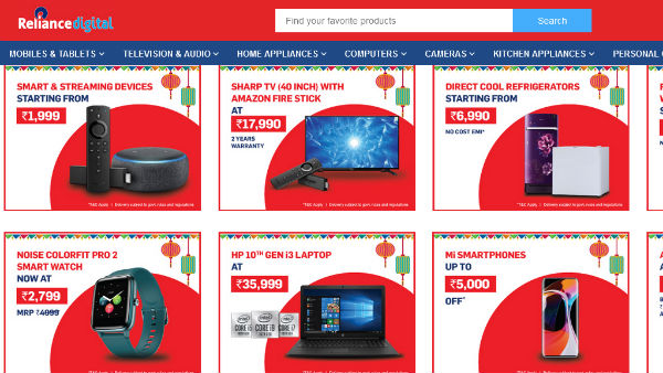 ಈ ವರ್ಷದ ಹಬ್ಬದ ಋತುವಿನಲ್ಲಿ ಎಲೆಕ್ಟ್ರಾನಿಕ್ಸ್ ಗಳ ಹಬ್ಬ. ಸುಲಭ ಹಣಕಾಸು ಸೌಲಭ್ಯ ಹಾಗೂ ಇಎಂಐ ಆಯ್ಕೆಗಳು. ರಿಲಯನ್ಸ್ ಡಿಜಿಟಲ್, ಮೈ ಜಿಯೋ ಸ್ಟೋರ್ಸ್ ಅಥವಾ ಆನ್ ಲೈನ್ ಯಾವುದೋ ಬೇಕೋ ಅದನ್ನು ಗ್ರಾಹಕರು ತಮ್ಮ ಅನುಕೂಲಕ್ಕೆ ತಕ್ಕಂತೆ ಆರಿಸಿಕೊಳ್ಳಬಹುದು. ತಕ್ಷಣವೇ ಡೆಲಿವರಿ ಆಗುತ್ತದೆ (ಮೂರು ಗಂಟೆಗಿಂತ ಕಡಿಮೆ ಅವಧಿಗೆ ಡೆಲಿವರಿ) ಮತ್ತು ಹತ್ತಿರದ ಸ್ಟೋರ್ ಗಳಿಂದಲೇ ತೆಗೆದುಕೊಂಡು ಹೋಗಬಹುದಾದ ಆಯ್ಕೆಯೂ ಇದೆ. ಷರತ್ತು ಹಾಗೂ ನಿಬಂಧನೆಗಳಿಗೆ ಒಳಪಟ್ಟಿದೆ.