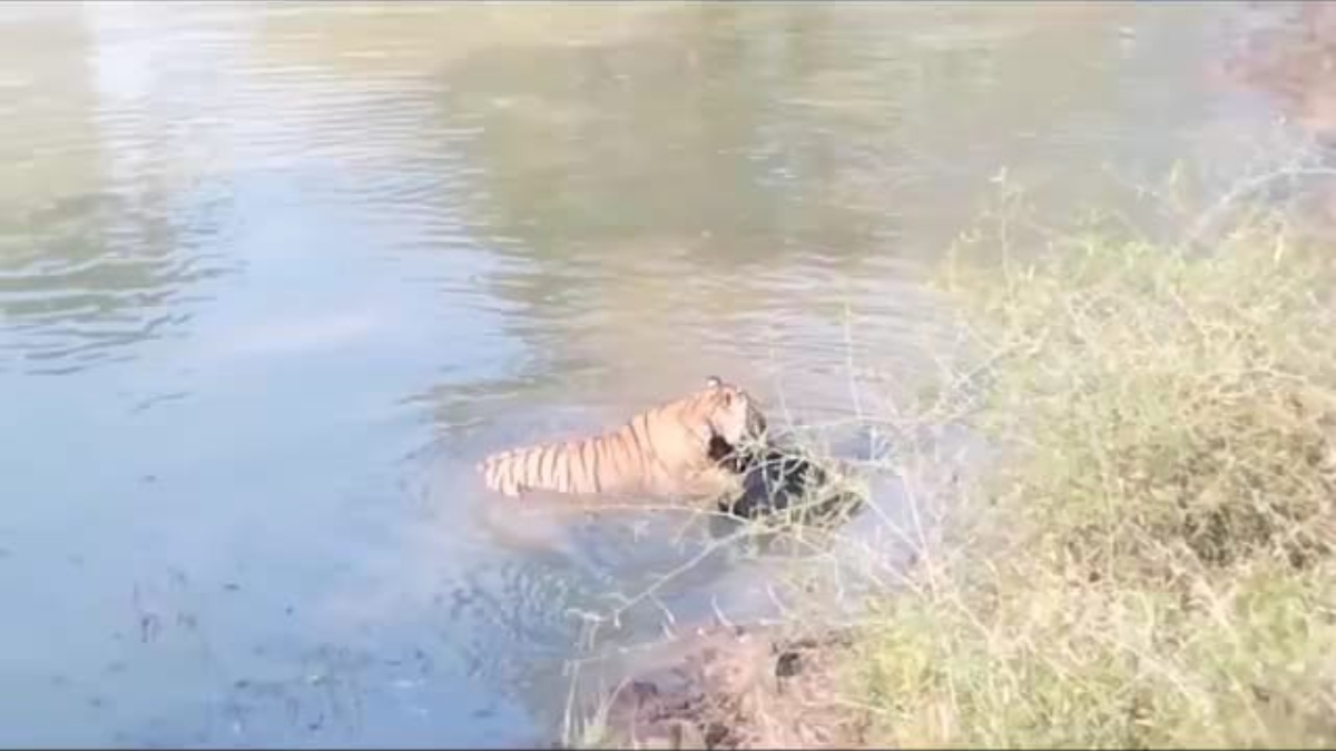 ಗುಂಡ್ಲುಪೇಟೆ: ಜಾಂಬವಂತನನ್ನು ಬೇಟೆಯಡಾಡಿದ ವ್ಯಾಘ್ರ, ವಿಡಿಯೋ ವೈರಲ್