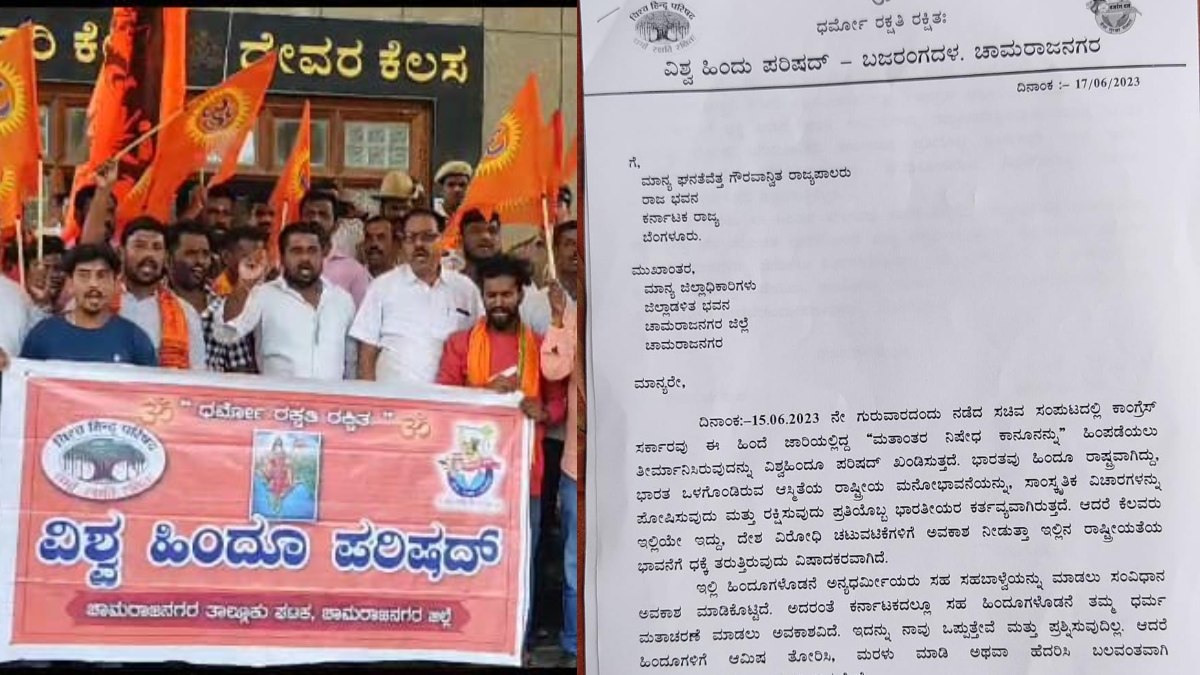 ಮತಾಂತರ ನಿಷೇಧ ಕಾಯ್ದೆ ವಾಪಸ್: ಚಾಮರಾಜನಗರದಲ್ಲಿ ಕಾಂಗ್ರೆಸ್ ವಿರುದ್ಧ ಹಿಂದೂಪರ ಸಂಘಟನೆಗಳ ಪ್ರತಿಭಟನೆ