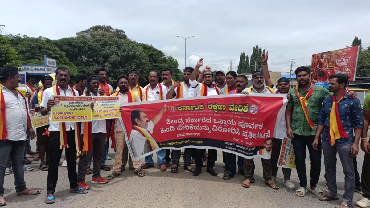 ಚಾಮರಾಜನಗರ, ಸೆಪ್ಟೆಂಬರ್, 14: ಕೇಂದ್ರ ಸರ್ಕಾರ ಹಿಂದಿ ದಿವಸ್ ಆಚರಣೆ ಮಾಡುತ್ತಿರುವುದನ್ನು ವಿರೋಧಿಸಿ ಇದೀಗ ರಾಜ್ಯದ್ಯಂತ ಪ್ರತಿಭಟನೆಗಳು ನಡೆಯುತ್ತಿದೆ. ಹಾಗೆಯೇ ಕರ್ನಾಟಕ ರಕ್ಷಣಾ ವೇದಿಕೆಯ ಕಾರ್ಯಕರ್ತರು ಚಾಮರಾಜನಗರ ಜಿಲ್ಲೆ ಗುಂಡ್ಲುಪೇಟೆ ಪಟ್ಟಣದಲ್ಲಿ ಇಂದು (ಸೆಪ್ಟೆಂಬರ್ 14) ಪ್ರತಿಭಟನೆ ನಡೆಸಿದರು.