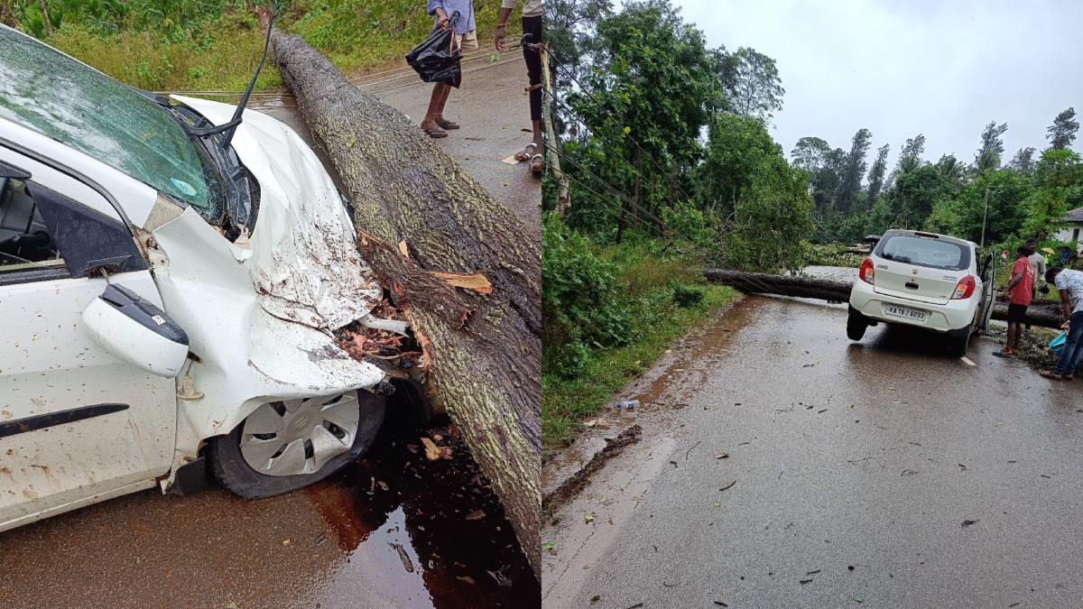 ಚಲಿಸುತ್ತಿದ್ದ ಕಾರಿನ ಮೇಲೆ ಬಿದ್ದ ಬೃಹತ್ ಮರ: ಚಿಕ್ಕಮಗಳೂರು-ಶೃಂಗೇರಿ ಹೆದ್ದಾರಿ ಬಂದ್