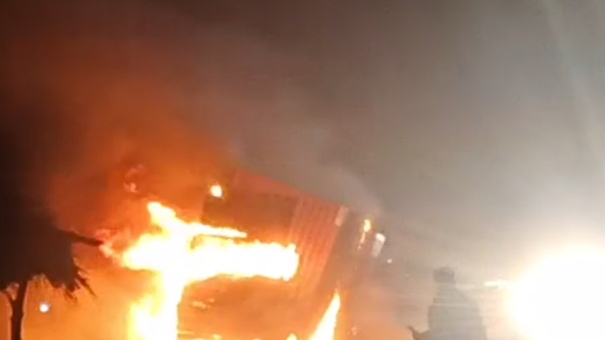ಟಯರ್ ಸ್ಪೋಟ- ಮಧ್ಯ ರಾತ್ರಿಯಲ್ಲಿ ಹೊತ್ತಿ ಉರಿದ ಕಂಟೇನರ್ ಲಾರಿ!