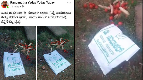 ಚಿತ್ರದುರ್ಗ ಜಿಲ್ಲೆಯಲ್ಲಿ ಮಾಜಿ ಸಚಿವ ಡಿ.ಸುಧಾಕರ್ ಹೆಸರಿನಲ್ಲಿ ತರಕಾರಿ ಕೊಟ್ಟಿದ್ದಾರೆ. ಆದರೆ ತರಕಾರಿ ಕೊಳೆತಿದೆಯೆಂದು ಗ್ರಾಮಸ್ಥರು ಬೀದಿಗೆ ಎಸೆದಿರುವ ಘಟನೆ ಚಿತ್ರದುರ್ಗ ಜಿಲ್ಲೆಯ ಹಿರಿಯೂರು ತಾಲ್ಲೂಕಿನ ಹರಿಯಬ್ಬೆಪಾಳ್ಯ ಗ್ರಾಮದಲ್ಲಿ ನಡೆದಿದೆ.