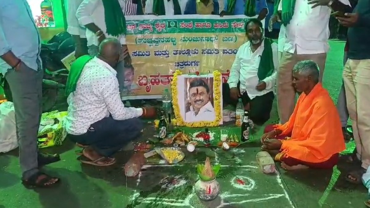 ಚಿತ್ರದುರ್ಗ ನಗರದ ಮುಖ್ಯ ಸರ್ಕಲ್ನಲ್ಲಿ ತಮಿಳುನಾಡು ಮುಖ್ಯಮಂತ್ರಿ ಎಂ.ಕೆ ಸ್ಟಾಲಿನ್ ಫೋಟೋ ಇಟ್ಟು ಅಣುಕು ತಿಥಿ ಆಚರಿಸುವ ಮೂಲಕ ಆಕ್ರೋಶ ಹೊರ ಹಾಕಿದ್ದಾರೆ. ಎಂ.ಕೆ ಸ್ಟಾಲಿನ್ ಫೋಟೋ ಮುಂದೆ ಶಾಸ್ತ್ರೋಕ್ತವಾಗಿ ಪೂಜೆ ಸಲ್ಲಿಸಿ, ಮದ್ಯಪಾನ, ಚಿಕನ್, ಮಟನ್, ಸಿಗರೇಟ್ ಇಟ್ಟು ಅಣುಕು ಪುಣ್ಯತಿಥಿ ಆಚರಣೆ ಮಾಡಿದ್ದಾರೆ.