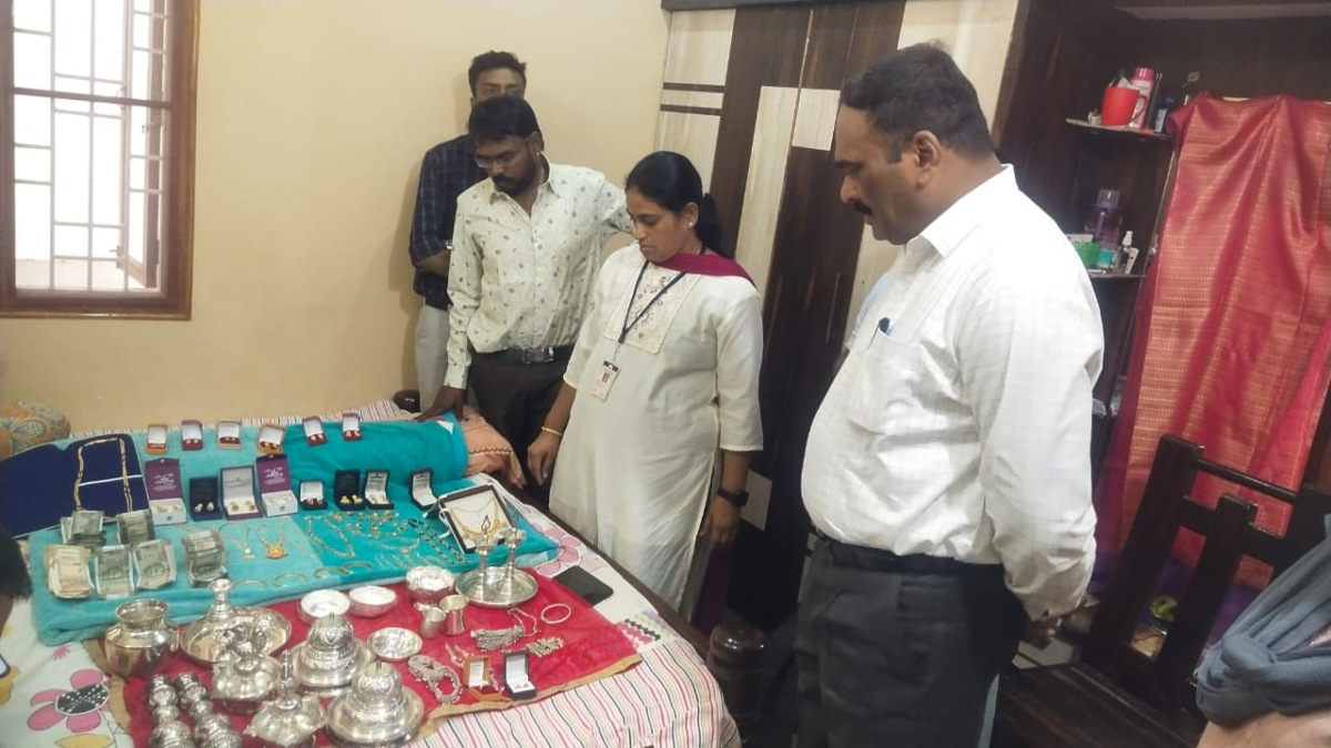 ಚಿತ್ರದುರ್ಗದ ಸಮಾಜ ಕಲ್ಯಾಣ ಇಲಾಖೆ ಸಹಾಯಕ ನಿರ್ದೇಶಕ ವಿ ಕೃಷ್ಣಮೂರ್ತಿ ಅವರ ಕುವೆಂಪು ನಗರದಲ್ಲಿರುವ ನಿವಾಸದ ಮೇಲೆ ದಾಳಿ ನಡೆಸಿದ ವೇಳೆ 600 ಗ್ರಾಂ ಚಿನ್ನ, 2ಕೆಜಿ ಬೆಳ್ಳಿ, 2ಕಾರು ಹಾಗೂ 10 ನಿವೇಶನಗಳು ಪತ್ತೆಯಾಗಿವೆ.