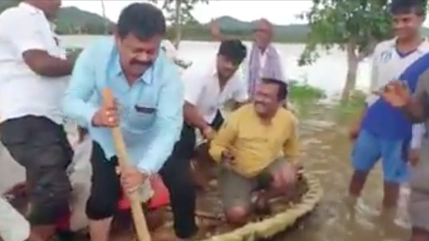 ಮೊಣಕಾಲುದ್ದ ನೀರಲ್ಲಿ ತೆಪ್ಪ ನಡೆಸಿದ ರೇಣುಕಾಚಾರ್ಯ!