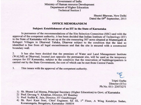 ಧಾರವಾಡದಲ್ಲಿ ಐಐಟಿ : ಅಧಿಕೃತ ಆದೇಶ ಪತ್ರ