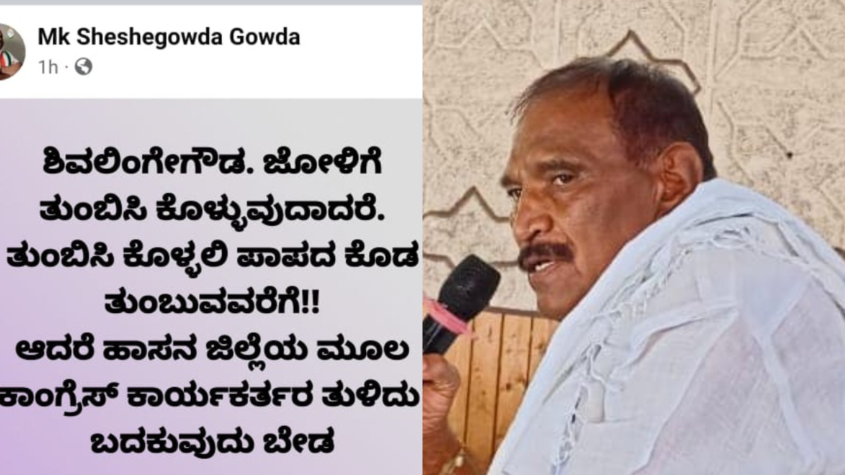 ತಮ್ಮ ಜೋಳಿಗೆ ತುಂಬಿಸಿಕೊಳ್ಳುವುದಿದ್ದರೆ ತುಂಬಿಸಿಕೊಳ್ಳಲಿ. ಅದರೆ ಹಾಸನ ಜಿಲ್ಲೆಯ ಮೂಲ ಕಾಂಗ್ರೆಸ್ ಕಾರ್ಯಕರ್ತರನ್ನು ತುಳಿದು ಬದುಕುವುದು ಬೇಡ ಎಂದು ಕೆಪಿಸಿಸಿ ಸದಸ್ಯ ಶೇಷೇಗೌಡ ತಮ್ಮ ಫೇಸ್ಬುಕ್ನಲ್ಲಿ ಬರೆದುಕೊಳ್ಳುವ ಮೂಲಕ ಶಾಸಕ ಶಿವಲಿಂಗೇಗೌಡರ ವಿರುದ್ಧ ಆಕ್ರೋಶ ಹೊರಹಾಕಿದ್ದಾರೆ.