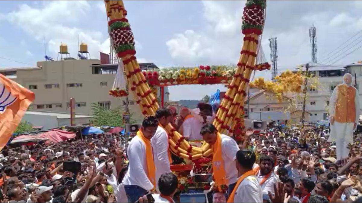 ಹೀಗೆ ಯಡಿಯೂರಪ್ಪ ಅವರು ಜೆಡಿಎಸ್ ಭದ್ರಕೋಟೆಯಾದ ಹಾಸನದಲ್ಲಿ ಕಮಲ ಅರಳಿಸಲು ಸಕಲ ಪ್ರಯತ್ನಗಳನ್ನು ಮಾಡುತ್ತಿದ್ದಾರೆ. ಇನ್ನು ಸಕಲೇಶಪುರ ಪಟ್ಟಣದ ಹಳೇ ಬಸ್ ನಿಲ್ದಾಣ ಬಳಿ ಮಾಜಿ ಸಿಎಂ ಯಡಿಯೂರಪ್ಪ ಅವರಿಗೆ ಅಭಿಮಾನಿಗಳು ಕ್ರೇನ್ ಮೂಲಕ ಸುಮಾರು ಮುನ್ನೂರು ಕೆ.ಜಿ. ತೂಕದ ಬೃಹತ್ ಜೋಳದ ಹಾರ ಹಾಕಿ ಸಂಭ್ರಮಿಸಿದರು.