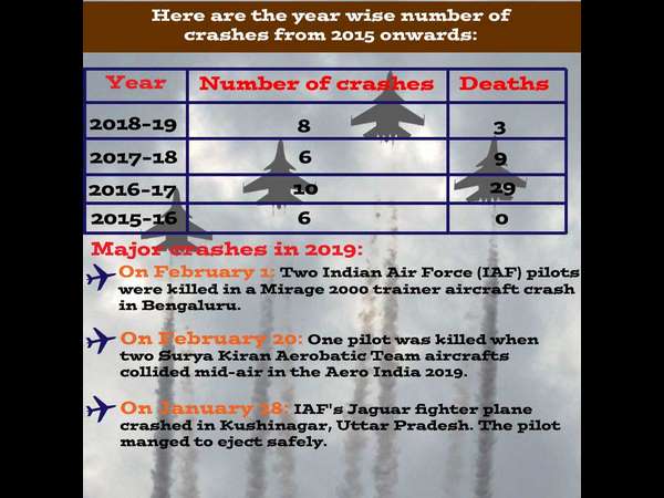 2019ರ ಎರಡು ತಿಂಗಳಿನಲ್ಲಿ ಮೂರು ವಿಮಾನಗಳು ಪತನಗೊಂಡಿವೆ. ಫೆ.1ರಂದು ಬೆಂಗಳೂರಿನಲ್ಲಿ ಮೀರಾಜ್ ವಿಮಾನ ಪತನಗೊಂಡು ಇಬ್ಬರು ಪೈಲೆಟ್ ಮೃತಪಟ್ಟಿದ್ದರು. ಜನವರಿ 28 ಮತ್ತು ಫೆಬ್ರವರಿ 20 ರಂದು ಎರಡು ವಿಮಾನ ಪತನದ ಪ್ರಕರಣದ ನಡೆದಿದೆ.