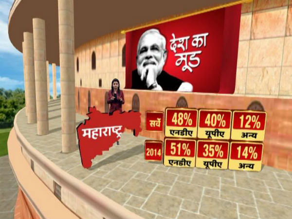 2014ರಲ್ಲಿ ನಡೆದಿದ್ದ ಚುನಾವಣೆಯಲ್ಲಿ ಎನ್ಡಿಎ ಮಹಾರಾಷ್ಟ್ರದಲ್ಲಿ ಶೇ.51ರಷ್ಟು ಮತ ಗಳಿಸಿದ್ದರೆ, ಇದೀಗ ಅದರ ಮತಗಳಿಕೆ ಶೇಕಡಾ 3ರಷ್ಟು ಕಡಿಮೆಯಾಗಲಿದೆ. ಆದರೆ, ಕಳೆದ ಬಾರಿ ಶೇ.35ರಷ್ಟು ಮಾತ್ರ ಮತ ಪಡೆದಿದ್ದ ಯುಪಿಎ ಈಬಾರಿ ಶೇ.40ರಷ್ಟು ಮತ ಪಡೆದು ಬಿಜೆಪಿ ಮತ್ತು ಶಿವಸೇನೆಗೆ ಬೆವರಿಳಿಸಲಿದೆ.