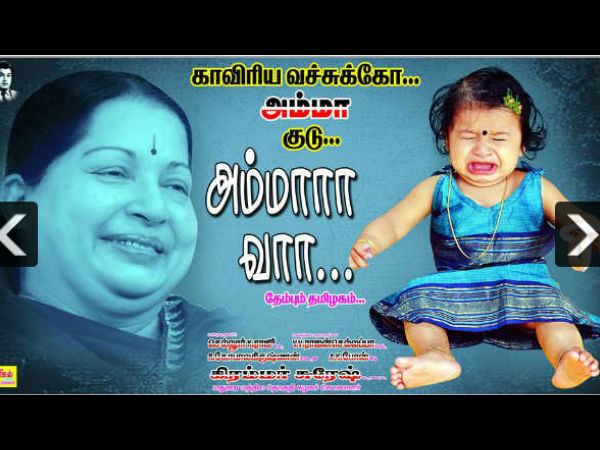 ಬ್ಯಾನರಿನ ಎಡಕ್ಕೆ ಜಯಾ ಭಾವಚಿತ್ರ, ಬಲದಲ್ಲಿ ಮಗುವೊಂದು ಜೋರಾಗಿ ಅಳುತ್ತಿರುವುದನ್ನು ಕಾಣಬಹುದು. ಮಗು ಅಳುತ್ತಾ ಕರ್ನಾಟಕ ರಾಜ್ಯಕ್ಕೆ ನಿವೇದನೆ ಮಾಡುವ ಹಾಗೇ ' ಕಾವೇರಿ ನೀವೇ ಇಟ್ಟುಕೊಳ್ಳಿ, ನಮಗೆ ಅಮ್ಮನನ್ನು ಕೊಡಿ.. ಅಮ್ಮಾ...' ಎಂದು ಬರೆಯಲಾಗಿದೆ. ಎಐಡಿಎಂಕೆಯ ಸ್ಥಳೀಯ ಮುಖಂಡರ ಹೆಸರಿನಲ್ಲಿ ಈ ಬ್ಯಾನರು ಮುದ್ರಣಗೊಂಡಿದೆ.