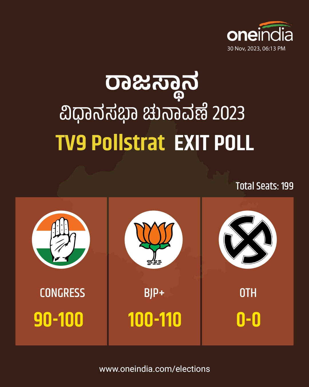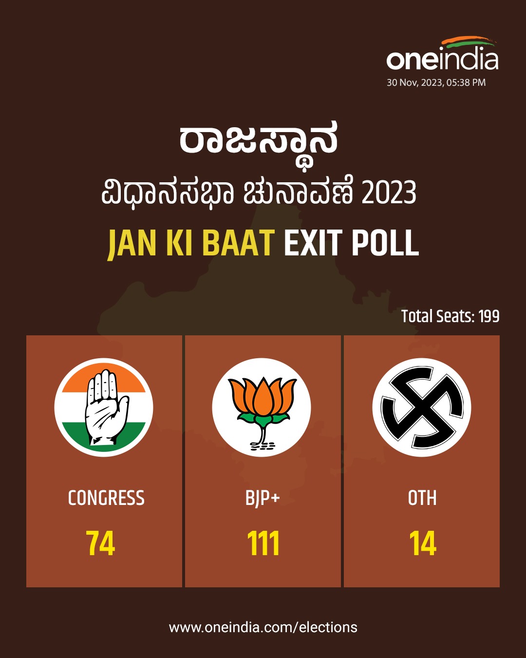 ನವೆಂಬರ್ 23 ರಂದು ರಾಜಸ್ಥಾನದ ವಿಧಾನಸಭಾ ಚುನಾವಣೆಗಳು ನಡೆದಿದೆ. ಮಧ್ಯಪ್ರದೇಶದಲ್ಲಿ ನವೆಂಬರ್ 17, ಛತ್ತೀಸ್ಗಢದಲ್ಲಿ ನವೆಂಬರ್ 7 ಮತ್ತು ನವೆಂಬರ್ 17 ರಂದು ಎರಡು ಹಂತದಲ್ಲಿ ಚುನಾವಣೆ ನಡೆದಿದೆ. ಸುದ್ದಿ ಸಂಸ್ಥೆಗಳು ಮತ್ತು ವಿವಿಧ ಏಜೆನ್ಸಿಗಳು ನಡೆಸಿದ ಮತಗಟ್ಟೆ ಸಮೀಕ್ಷೆಗಳು ನಿರ್ದಿಷ್ಟ ಪ್ರದೇಶಗಳ ಮತದಾನದ ಮಾದರಿಗಳ ಒಳನೋಟಗಳನ್ನು ಸಂಗ್ರಹಿಸಿ ಬಿಡುಗಡೆ ಮಾಡಿವೆ. ಕಾತರರಿಂದ ಕಾಯ್ದಿದ್ದ ಎಕ್ಸಿಟ್ ಪೋಸ್ ಸಮೀಕ್ಷೆಯನ್ನು ಕಾಂಗ್ರೆಸ್ ಸ್ವಾಗತಿಸಿದೆ. ಬಿಜೆಪಿ ತಿರಸ್ಕರಿಸಿದೆ. ಇನ್ನೂ ಫಲಿತಾಂಶ ತೆಲಂಗಾಣದ ಬಿಆರ್ಎಸ್ ಪಕ್ಷಕ್ಕೆ ಆಘಾತ ತಂದಿದೆ.