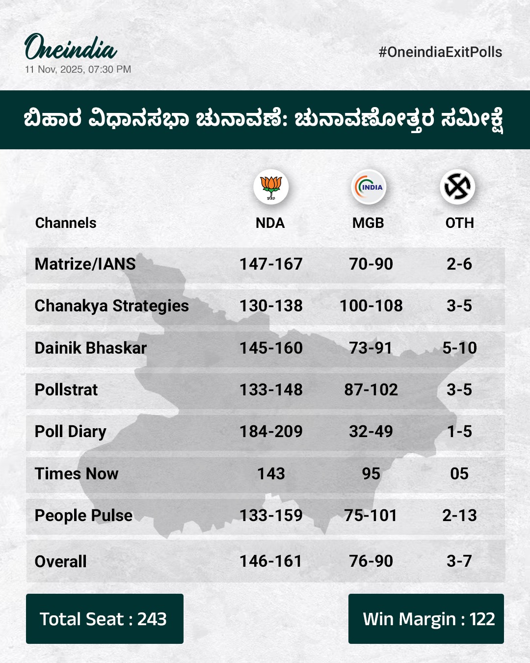ಬಿಹಾರದ 243 ವಿಧಾನಸಭಾ ಕ್ಷೇತ್ರಗಳಿಗೆ ಎರಡು ಹಂತಗಳಲ್ಲಿ ಮತದಾನ ನಡೆದಿದೆ. ನವೆಂಬರ್ 14ರಂದು ಚುನಾವಣಾ ಫಲಿತಾಂಶಗಳನ್ನು ಘೋಷಿಸುವ ನಿರೀಕ್ಷೆಯಿದೆ. ನವೆಂಬರ್ 6ರಂದು ಮೊದಲ ಹಂತದಲ್ಲಿ 18 ಜಿಲ್ಲೆಗಳ 121 ಕ್ಷೇತ್ರಗಳಲ್ಲಿ ಶೇ 65.08ರಷ್ಟು ಮತದಾನ ನಡೆದಿತ್ತು. ನವೆಂಬರ್ 11ರಂದು ಮಂಗಳವಾರ ಎರಡನೇ ಹಂತದಲ್ಲಿ 20 ಜಿಲ್ಲೆಗಳ ಉಳಿದ 122 ಕ್ಷೇತ್ರಗಳಲ್ಲಿ ಮತದಾನ ನಡೆದಿದೆ. ಚುನಾವಣೆಗೆ ತೆರೆ ಬೀಳುತ್ತಿದ್ದಂತೆ ಹಿನ್ನೆಲೆ ಚುನಾವಣೋತ್ತರ ಸಮೀಕ್ಷೆಗಳ (ಎಕ್ಸಿಟ್ ಪೋಲ್) ಫಲಿತಾಂಶಗಳು ಬಿಹಾರದಲ್ಲಿ ಪಟ್ಟಕ್ಕೇರುವುದು ಯಾರು? ಎಂದು ಭವಿಷ್ಯ ನುಡಿದಿವೆ.