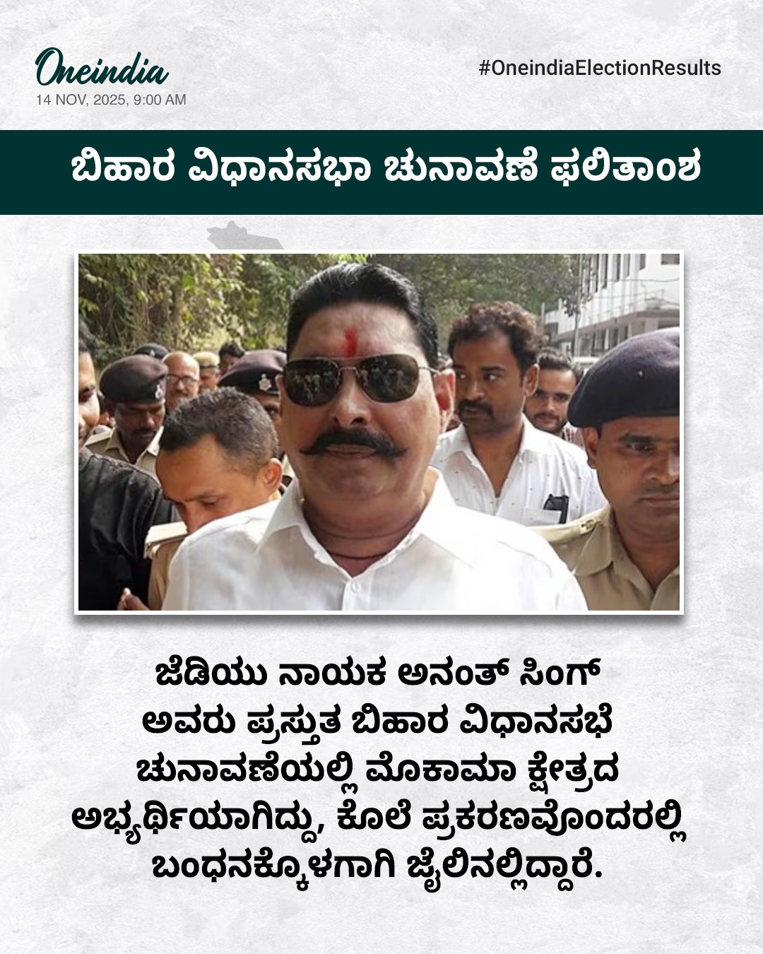 ಬಿಹಾರ ವಿಧಾನಸಭೆ ಚುನಾವಣೆಯಲ್ಲಿ ಸ್ಪರ್ಧಿಸಿದ್ದ ಜೈಲಿನಲ್ಲಿರುವ ಜೆಡಿಯು ನಾಯಕ ಅನಂತ್ ಸಿಂಗ್ ಮೊಕಾಮಾ ಕ್ಷೇತ್ರದಿಂದ ಗೆಲುವು ಸಾಧಿಸಿದ್ದಾರೆ. ಎದುರಾಳಿ ಅಭ್ಯರ್ಥಿ ಆರ್ಜೆಡಿ ಪಕ್ಷದ ವೀಣಾ ದೇವಿಯನ್ನು 28,000ಕ್ಕೂ ಹೆಚ್ಚು ಮತಗಳ ಅಂತರದಿಂದ ಸೋಲಿಸಿದ್ದಾರೆ.