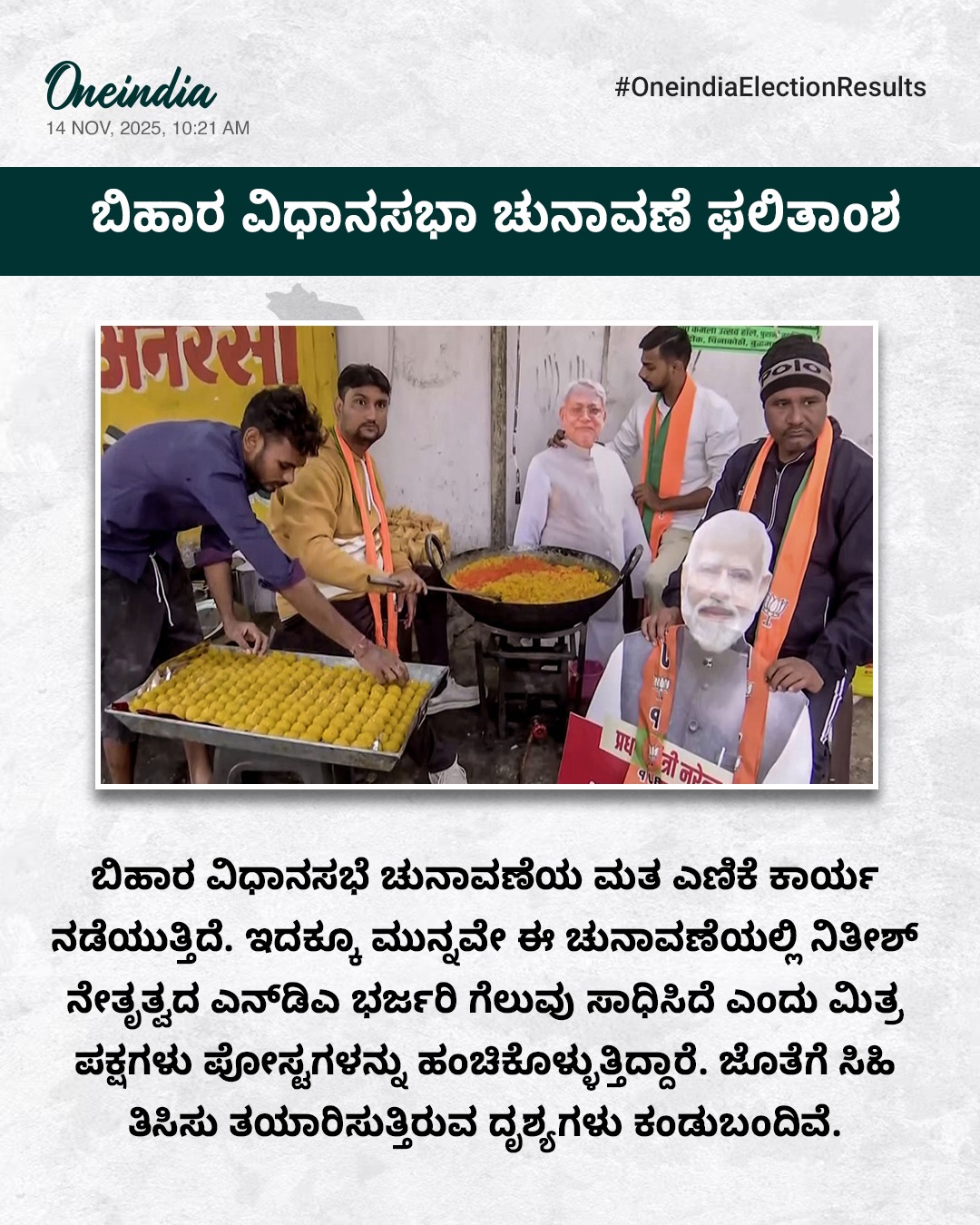 ಬಿಹಾರ ಚುನಾವಣಾ ಫಲಿತಾಂಶದ ಬಗ್ಗೆ ಪ್ರಧಾನಿ ಮೋದಿ ಟ್ವೀಟ್ ಮಾಡಿದ್ದಾರೆ. ಬಿಹಾರಕ್ಕೆ ಎನ್ಡಿಎ ಸರ್ವತೋಮುಖ ಅಭಿವೃದ್ಧಿಯನ್ನು ಒದಗಿಸಿದೆ. ನಮ್ಮ ಹಿಂದಿನ ಸಾಧನೆ ಮತ್ತು ರಾಜ್ಯವನ್ನು ಹೊಸ ಎತ್ತರಕ್ಕೆ ಕೊಂಡೊಯ್ಯುವ ನಮ್ಮ ದೂರದೃಷ್ಟಿಯ ಆಧಾರದ ಮೇಲೆ ಜನರು ನಮಗೆ ಮತ ಹಾಕಿದ್ದಾರೆ. ಈ ಅಪ್ರತಿಮ ವಿಜಯಕ್ಕಾಗಿ ಸಿಎಂ ನಿತೀಶ್ ಕುಮಾರ್ ಜಿ ಮತ್ತು ಎನ್ಡಿಎ ಕುಟುಂಬದ ನಮ್ಮ ಮಿತ್ರರಾದ ಚಿರಾಗ್ ಪಾಸ್ವಾನ್ ಜಿ, ಜಿತನ್ ರಾಮ್ ಮಾಂಝಿ ಜಿ ಮತ್ತು ಉಪೇಂದ್ರ ಕುಶ್ವಾಹ ಜಿ ಅವರನ್ನು ನಾನು ಅಭಿನಂದಿಸುತ್ತೇನೆ ಎಂದಿದ್ದಾರೆ. ಮುಂಬರುವ ದಿನಗಳಲ್ಲಿ, ಬಿಹಾರದ ಪ್ರಗತಿ, ಬಿಹಾರದ ಮೂಲಸೌಕರ್ಯ ಮತ್ತು ಬಿಹಾರದ ಸಂಸ್ಕೃತಿಗಾಗಿ ನಾವು ಇನ್ನೂ ಹೆಚ್ಚಿನದನ್ನು ಮಾಡುತ್ತೇವೆ. ರಾಜ್ಯದ ಯುವಶಕ್ತಿ ಮತ್ತು ನಾರಿಶಕ್ತಿ ಸಮೃದ್ಧ ಜೀವನವನ್ನು ನಡೆಸಲು ಅನೇಕ ಅವಕಾಶಗಳನ್ನು ಪಡೆಯುವುದನ್ನು ನಾವು ಖಚಿತಪಡಿಸಿಕೊಳ್ಳುತ್ತೇವೆ ಎಂದು ಮೋದಿ ಭರವಸೆ ನೀಡಿದ್ದಾರೆ.