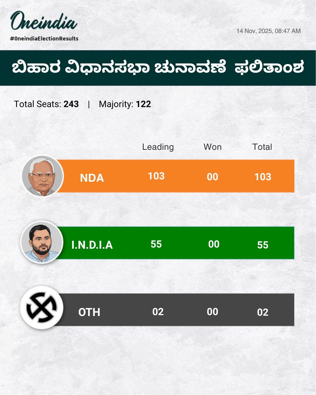 ಭಾರತೀಯ ಚುನಾವಣಾ ಆಯೋಗದ ಇತ್ತೀಚಿನ ಅಪ್ಡೇಟ್ಸ್ಗಳ ಪ್ರಕಾರ, ಬಿಹಾರದಲ್ಲಿ ಎನ್ಡಿಎ ಭಾರಿ ಗೆಲುವು ಸಾಧಿಸುವುದು ಬಹುತೇಕ ಖಚಿತವಾಗಿದೆ. ಎನ್ಡಿಎ ಇದೀಗ 200 ಸ್ಥಾನಗಳ ಸಮೀಪದಲ್ಲಿದೆ. ಆಡಳಿತಾರೂಢ ಮೈತ್ರಿಕೂಟವು ಪ್ರಸ್ತುತ 198 ಸ್ಥಾನಗಳಲ್ಲಿ ಮುನ್ನಡೆ ಸಾಧಿಸಿದ್ದು, ಪ್ರತಿಸ್ಪರ್ಧಿ ಮಹಾಘಟಬಂಧನ್ ಮುಖಭಂಗ ಅನುಭವಿಸಿದೆ. NDA ಪ್ರಾರಂಭದಿಂದಲೂ ಮುನ್ನಡೆ ಸಾಧಿಸಿಕೊಂಡು ಬಂದಿದೆ. ಮಹಾಘಟಬಂಧನ್ ಕೇವಲ 41 ಸ್ಥಾನಗಳಲ್ಲಿ ಮುನ್ನಡೆ ಸಾಧಿಸಿದ್ದರಿಂದ ಬಿಹಾರ ರಾಜಕೀಯ ಚಿತ್ರಣ ಸಂಪೂರ್ಣ ಬದಲಾಗಿದೆ.