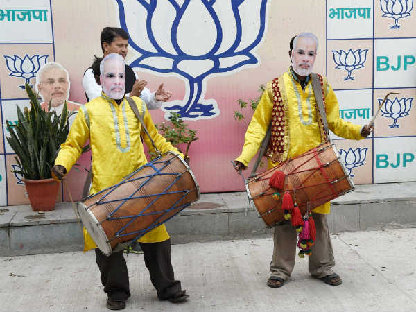 ನವದೆಹಲಿಯ ಬಿಜೆಪಿ ಕಚೇರಿಯಲ್ಲಿ ಪ್ರಧಾನಿ ಮೋದಿ ಮುಖವಾಡ ಧರಿಸಿದ ಕಾರ್ಯಕರ್ತರು ಎರಡೂ ರಾಜ್ಯದಲ್ಲಿ ಮೋದಿ ಮ್ಯಾಜಿಕ್ ನಡೆಯಿತು ಎಂದು ಸಂಭ್ರಮಿಸಿದರು.