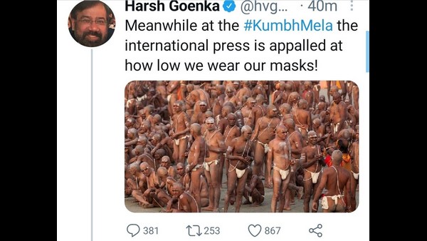 ಕುಂಭಮೇಳದ ಫೋಟೊವೊಂದನ್ನು ಹಂಚಿಕೊಂಡಿರುವ ಗೋಯೆಂಕಾ, ಕೆಲವು ಸಾಲುಗಳನ್ನು ಬರೆದಿದ್ದಾರೆ. "ಕುಂಭಮೇಳದಲ್ಲಿ ಮಾಸ್ಕ್ ಅನ್ನು ಎಷ್ಟು ಕೆಳಗೆ ಧರಿಸುತ್ತೇವೆ ಎಂಬುದನ್ನು ನೋಡಿ ಅಂತರರಾಷ್ಟ್ರೀಯ ಪತ್ರಿಕೆಗಳು ದಿಗಿಲುಗೊಳ್ಳಬಹುದು" ಎಂದು ವ್ಯಂಗ್ಯವಾಗಿ ಬರೆದುಕೊಂಡಿದ್ದಾರೆ. ಜೊತೆಗೆ ಶಿವ ಭೂಲೋಕಕ್ಕೆ ಬಂದು ಮದ್ಯ ಸೇವಿಸುವ ಕುರಿತು ಟ್ವಿಟ್ಟರ್ನಲ್ಲಿ ಹಾಸ್ಯವೊಂದನ್ನು ಹಂಚಿಕೊಂಡಿರುವುದು ಆಕ್ರೋಶ ಹುಟ್ಟುಹಾಕಿದೆ.