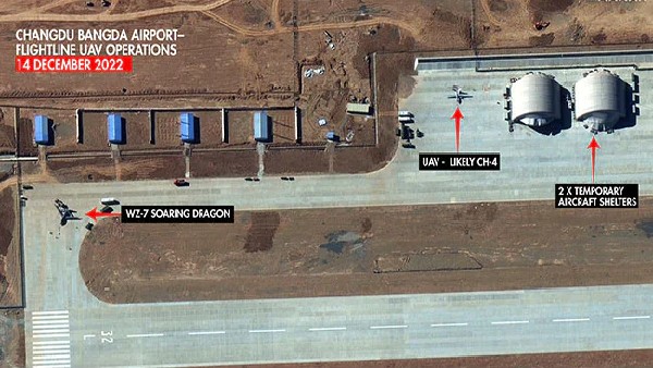 ಅರುಣಾಚಲ ಪ್ರದೇಶದ ಗಡಿಯ ಈಶಾನ್ಯಕ್ಕೆ, ಕೇವಲ 150 ಕಿಮೀ ದೂರದಲ್ಲಿರುವ ಚೀನಾದ ಬಾಂಗ್ಡಾ ಏರ್ಬೇಸ್ನ ಚಿತ್ರದದಲ್ಲಿ ಅತ್ಯಾಧುನಿಕ WZ-7 'ಸೋರಿಂಗ್ ಡ್ರ್ಯಾಗನ್' ಡ್ರೋನ್ಗಳು ನಿಂತಿರುವುದು ಕಂಡುಬಂದಿದೆ.