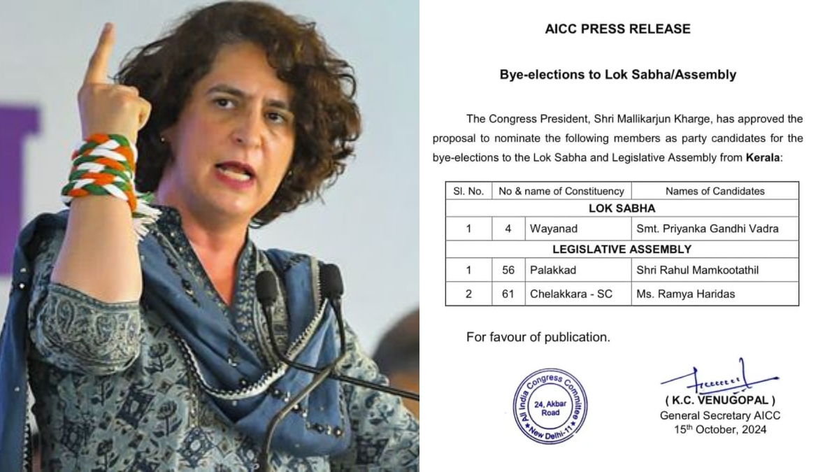 ನವದೆಹಲಿ, ಅಕ್ಟೋಬರ್ 15: ಕೇರಳದಲ್ಲಿ ಒಂದು ಲೋಕಸಭಾ ಕ್ಷೇತ್ರ ಹಾಗೂ ಎರಡು ವಿಧಾನಸಭಾ ಕ್ಷೇತ್ರಗಳಿಗೆ ಉಪಚುನಾವಣೆ ಘೋಷಣೆ ಆಗಿದೆ. ಕೇರಳದ ವಯನಾಡು ಲೋಕಸಭಾ ಕ್ಷೇತ್ರದ ಉಪ ಚುನಾವಣೆಗೆ ಪ್ರಿಯಾಂಕಾ ಗಾಂಧಿ ವಾದ್ರಾ ಅವರು ಸ್ಪರ್ಧಿಸುವುದನ್ನು ಎಐಸಿಸಿ ಮಂಗಳವಾರ ಖಚಿತಪಡಿಸಿದೆ. ಪ್ರಿಯಾಂಕಾ ಗಾಂಧಿ ಹೆಸರು ಸೇರಿದಂತೆ ಮೂರು ಅಭ್ಯರ್ಥಿಗಳನ್ನು ಘೋಷಿಸಿ ಕಾಂಗ್ರೆಸ್ ಪಟ್ಟಿ ಹೊರಡಿಸಿದೆ.