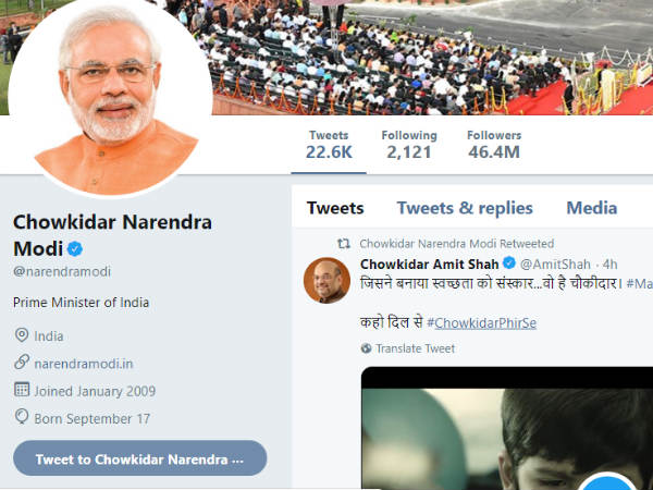 ಬೆಂಗಳೂರು, ಮಾರ್ಚ್ 17 : #MeinBhichowkidar ಎಂಬ ಘೋಷಣೆ ಅಭಿಯಾನವಾಗಿದೆ. ಪ್ರಧಾನಿ ನರೇಂದ್ರ ಮೋದಿ ಅವರು ತಮ್ಮ ಟ್ವಿಟರ್ ಖಾತೆಯನ್ನು Chowkidar Narendra Modi ಎಂದು ಬದಲಿಸಿಕೊಂಡಿದ್ದಾರೆ.