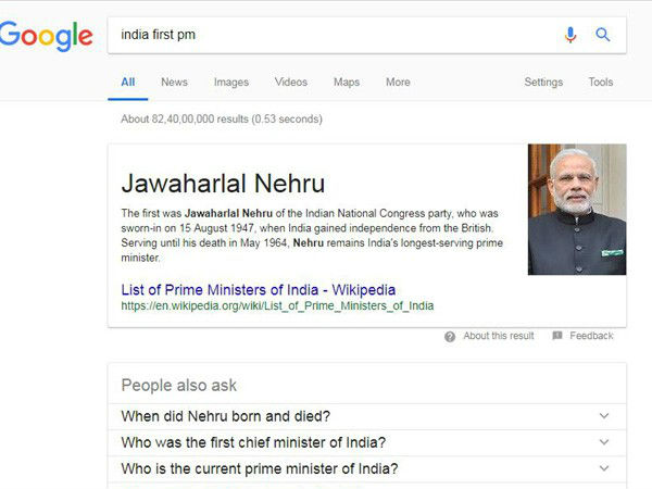 ನವದೆಹಲಿ, ಏಪ್ರಿಲ್ 26: ಭಾರತದ ಮೊದಲ ಪ್ರಧಾನಿ ಯಾರು? ಪುಟ್ಟ ಮಗುವಾದರೂ ಅದಕ್ಕೆ ಥಟ್ ಅಂತ ಉತ್ತರಿಸಿಬಿಡುತ್ತದೆ, 'ಜವಹರಲಾಲ್ ನೆಹರು' ಎಂದು! ಆದರೆ ಮಾಹಿತಿಯ ಕಣಜ 'ಗೂಗಲಮ್ಮ' ನ ಬಳಿ ಇದೇ ಪ್ರಶ್ನೆ ಟೈಪಿಸಿ ನೋಡಿ! ಉತ್ತರವೇನೋ ನೆಹರು ಅಂತ ಬರುತ್ತೆ, ಸರಿ. ಆದರೆ ಚಿತ್ರ? ನೆಹರು ಅವರ ಚಿತ್ರದ ಬದಲು ನೆವರು ಕುಟುಂಬದ ರಾಜಕೀಯ ಬದ್ಧ ವೈರಿ ನರೇಂದ್ರ ಮೋದಿಯವರ ಚಿತ್ರ ಬರಬೇಕೇ?!