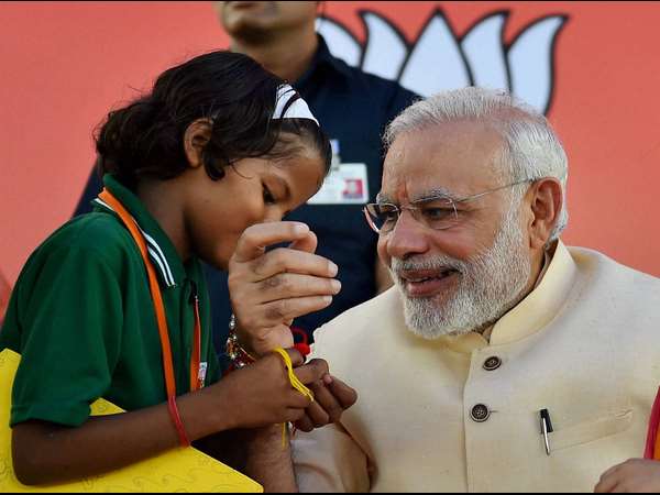 ನವದೆಹಲಿಯಲ್ಲಿ ನಡೆದ ಕಾರ್ಯಕ್ರಮವೊಂದರಲ್ಲಿ ಪ್ರಧಾನಿ ಮೋದಿಗೆ ರಾಖಿ ಕಟ್ಟಿದ ಬಾಲಕಿ.